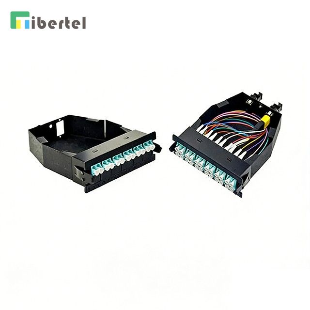 On the front of the module cassettes, it can be 12 ports of SC simplex connectors or LC duplex connectors, and back with 1 or 2 MPO adaptors. And with as harness cord pre-assembled inside of the cassettes.